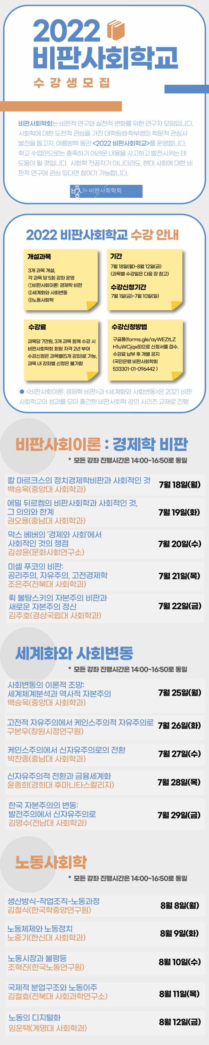 비판사회학회는 비판적 연구와 실천적 변화를 위한 연구자들의 모임입니다. 비판사회학회에서는 사회학에 대한 도전적 관심을 가진 대학원생들과 학부생들이 가지고 있는 학문적 관심사를 발전시켜가는 데 도움을 주고자 <2022 비판사회학교>를 여름방학 기간에 운영하기로 하였습니다. 학교 수업만으로는 충족하기 어려운 내용들을 함께 사고하고 발전시키는데 도움이 될 것입니다. 꼭 사회학 전공자가 아니더라도 현대 사회에 대한 비판적 연구에 관심있는 분들도 참여가 가능합니다.